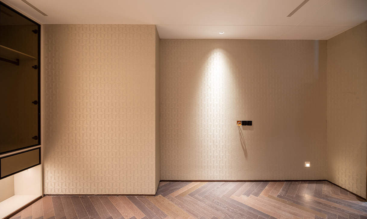 例如:别墅客厅的整面墙木饰面 + 隐形门 + 展示柜,既隐藏了房门,又增加了展示和储物空间,视觉上更统一。
